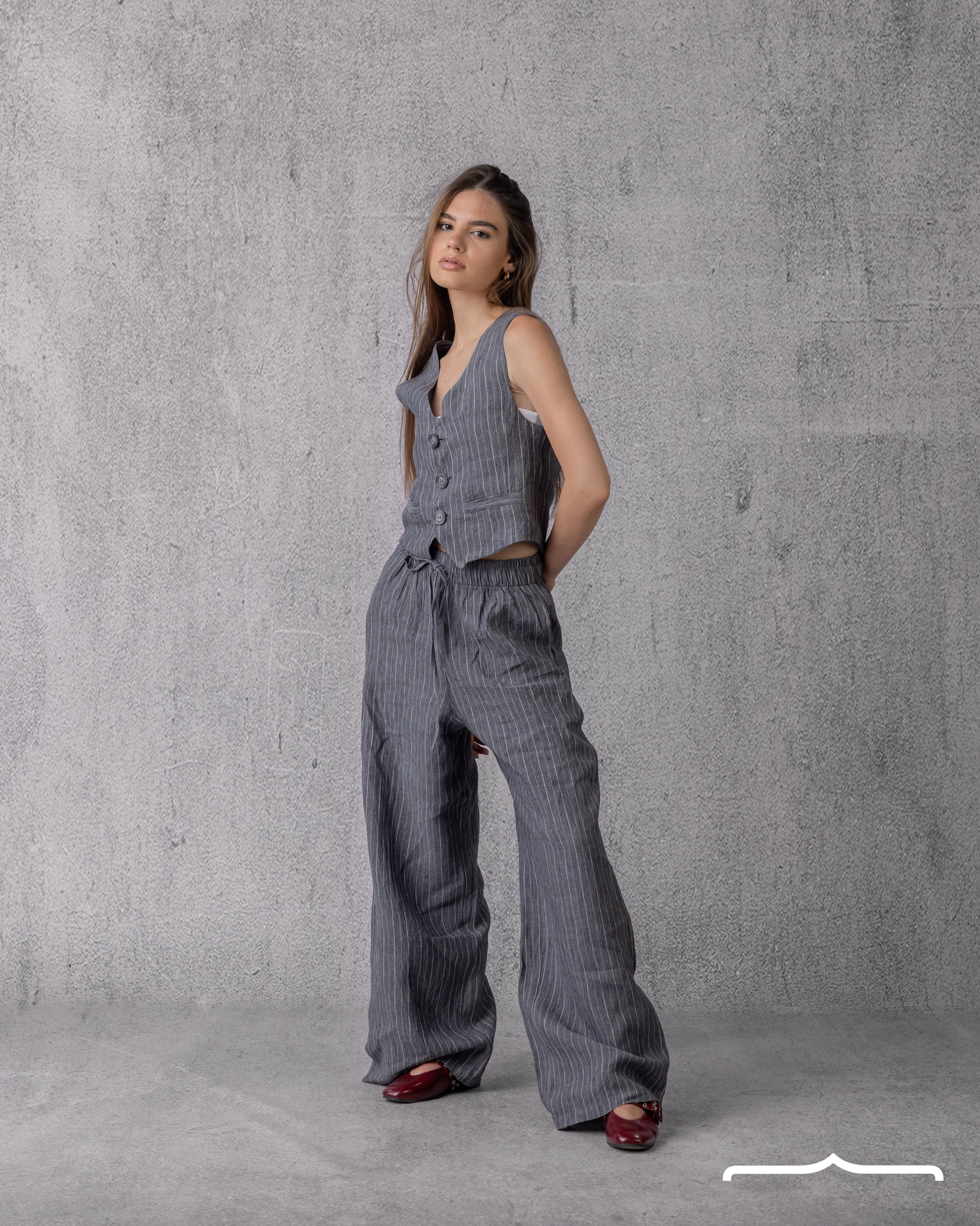 Elevate your summer style with this sophisticated striped linen set. The vest and matching bottoms create a cohesive and chic ensemble, perfect for making a statement while staying cool and stylish.