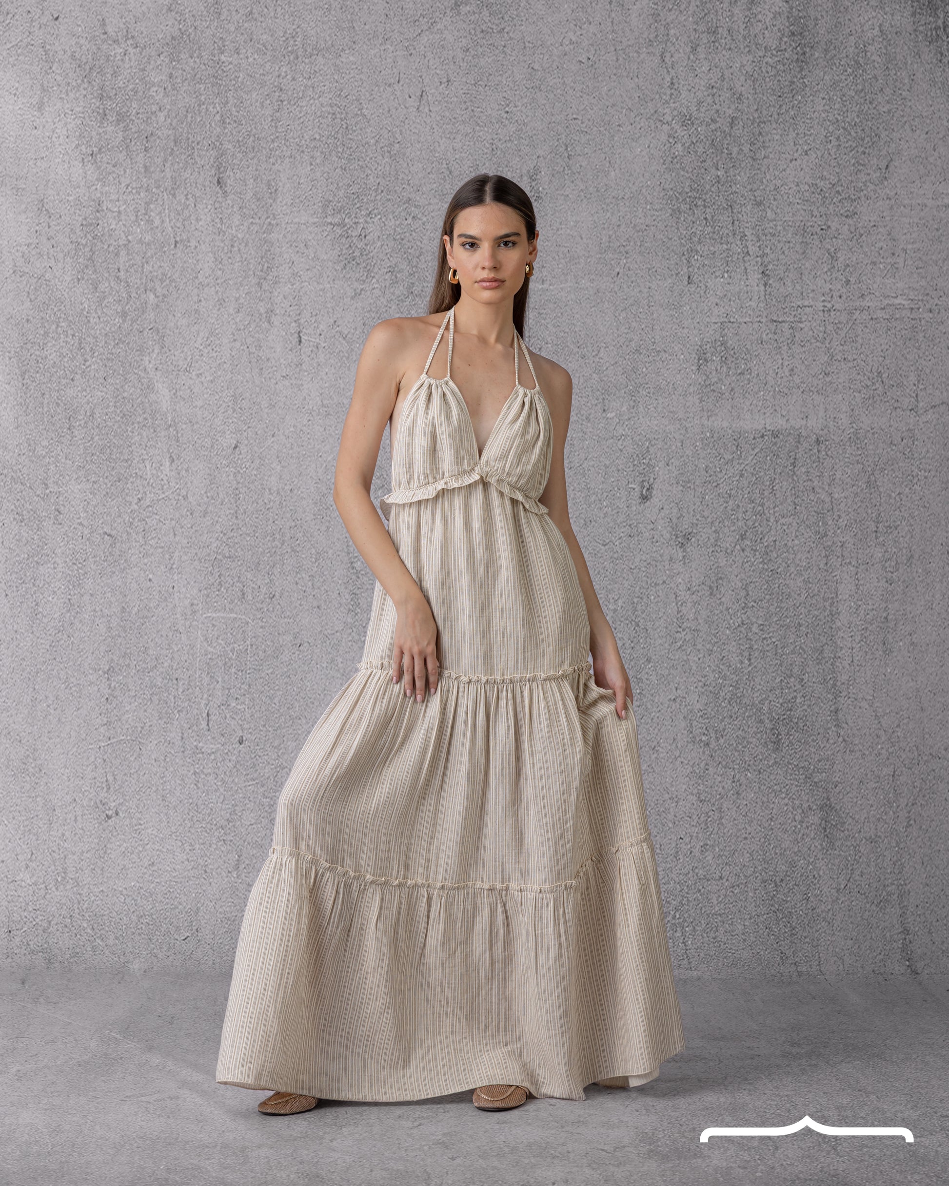 Float through summer in this beautiful pinstripe maxi dress. Made from flowing linen, it's designed for maximum comfort and effortless style, making it ideal for beach days or garden parties.