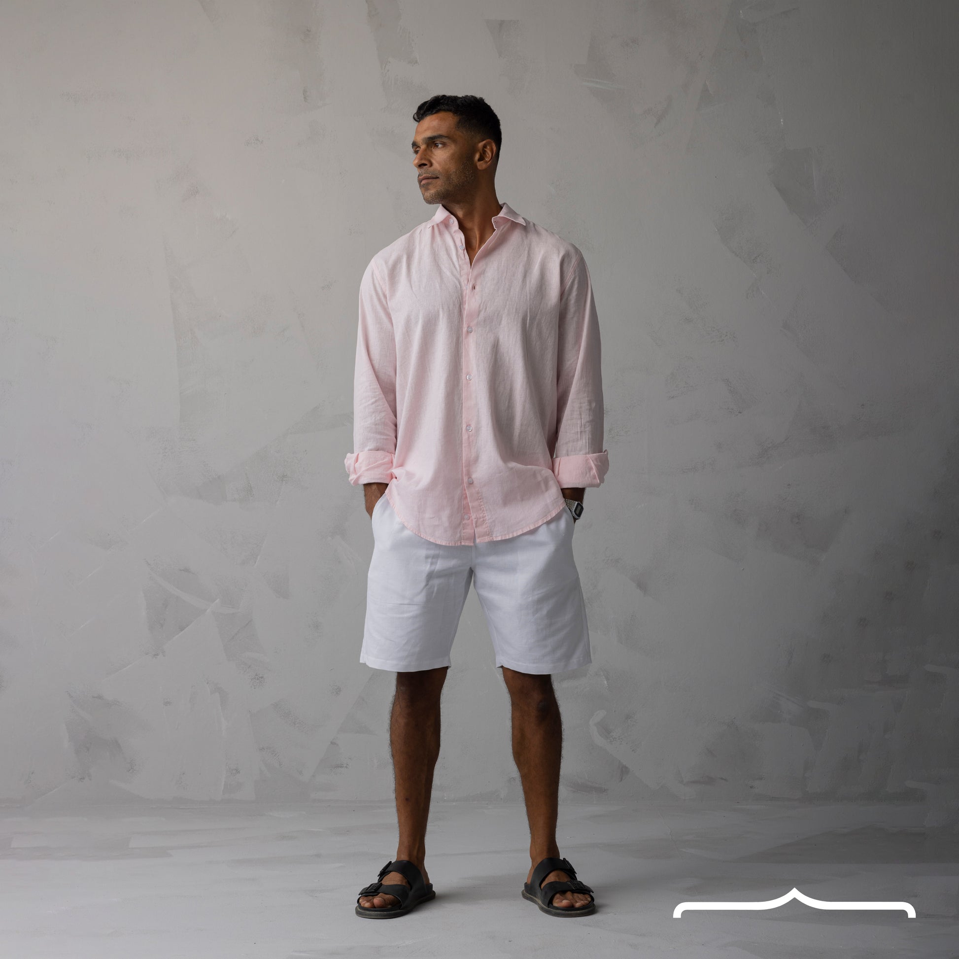 Soft pastel pink for a fresh twist on the classic linen shirt. Works well untucked over shorts or jeans.