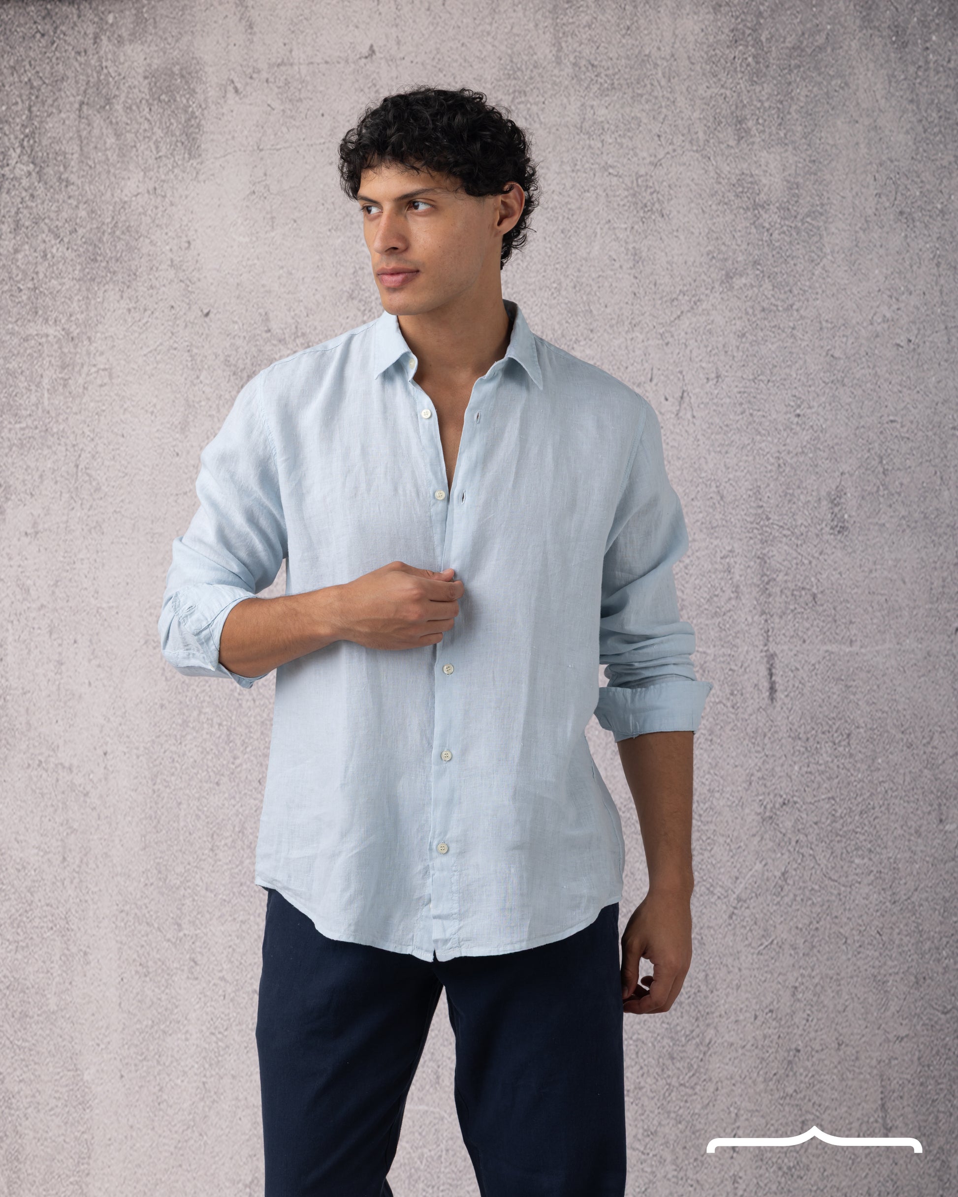 A relaxed cut in light blue linen — airy, with a soft drape. Great paired with white pants or light denim.