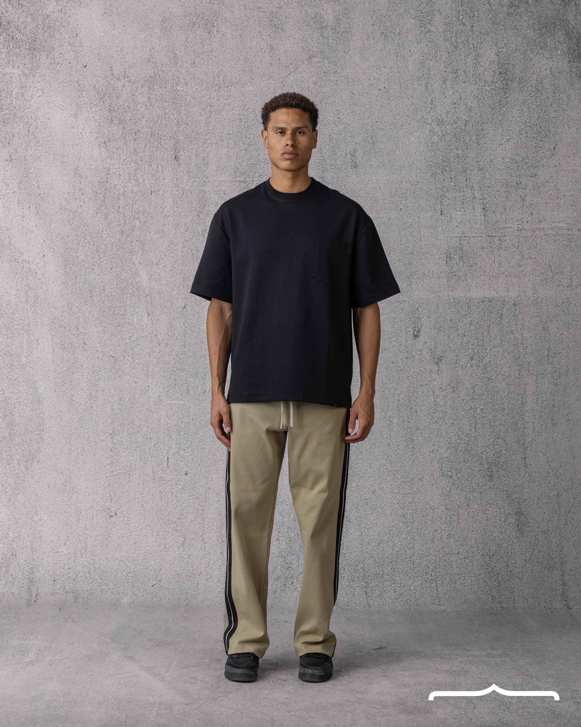 Olive color is flexible; stripes give an athletic edge; oversized, relaxed fit, comfort + style.