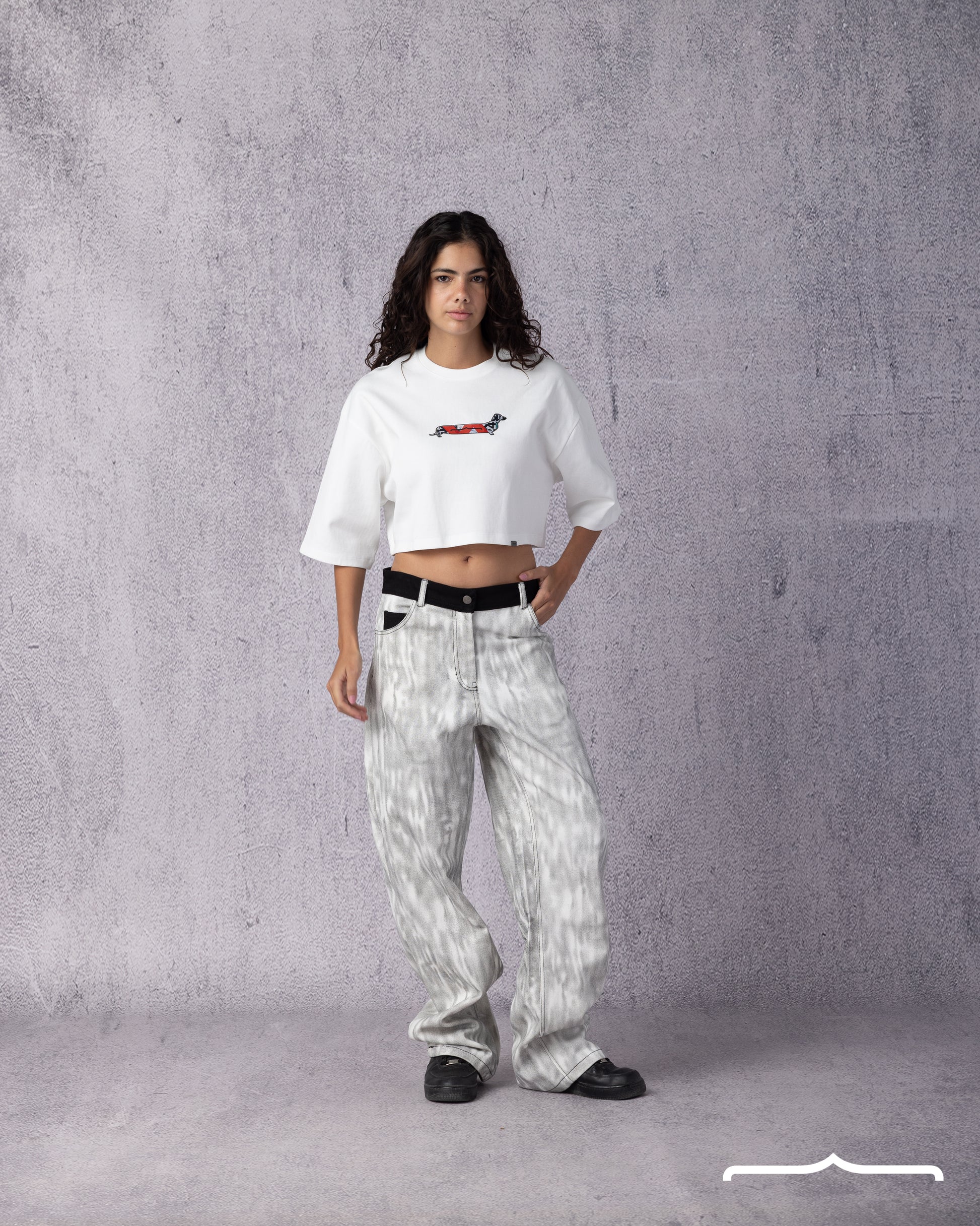 This cropped t-shirt makes a bold statement with its cool front print and relaxed oversized fit. Ideal for a casual day out or a trip to the beach, pair it with comfortable shorts and slip-on shoes for a laid-back look.