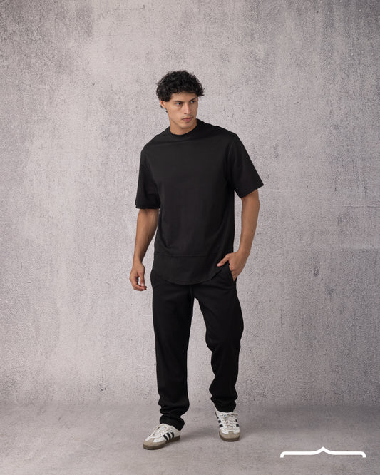 Transform your casual wardrobe with the Edge-Cut Oversized Tee in Black, crafted exclusively for men....