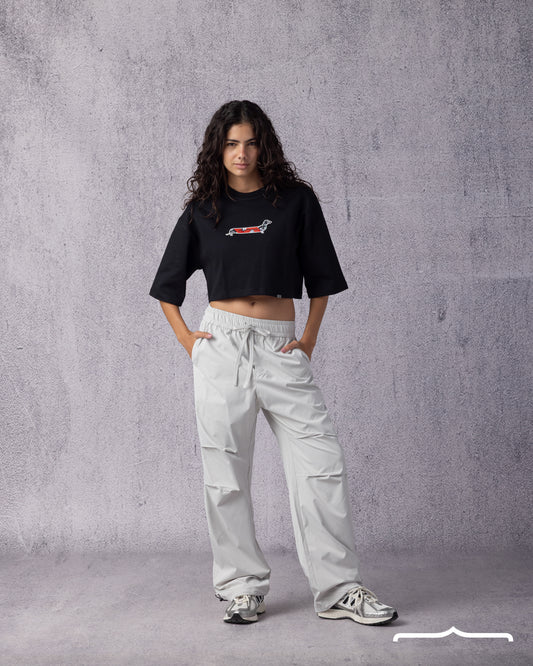The Sausage Dog Oversized Crop T-shirt in Black features a cool front print and a...
