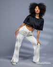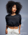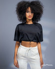 Effortless and versatile, this black cropped t-shirt comes with an adjustable drawstring hem for a customizable fit. Its oversized sleeves and relaxed cut make it easy to style, whether you’re dressing it up with tailored bottoms or keeping it casual with joggers.