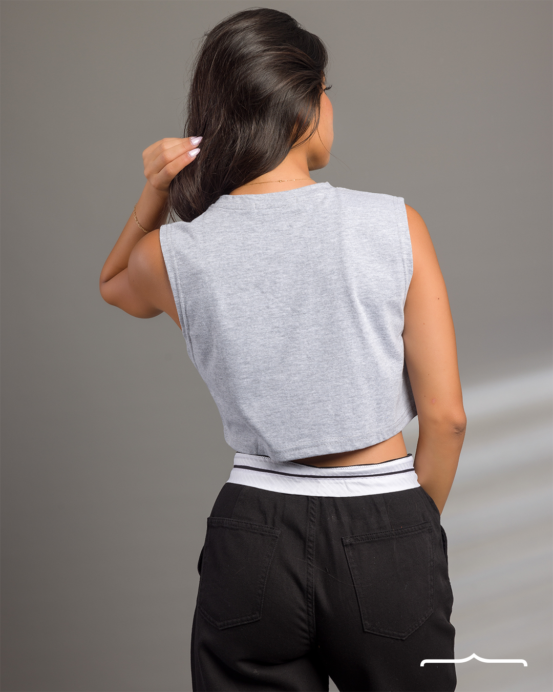 An oversized, round-neck crop top t-shirt with a simple design and "free spirited" written vertically on the front.