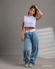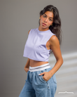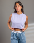 An oversized, round-neck crop top t-shirt with a simple design and "free spirited" written vertically on the front.