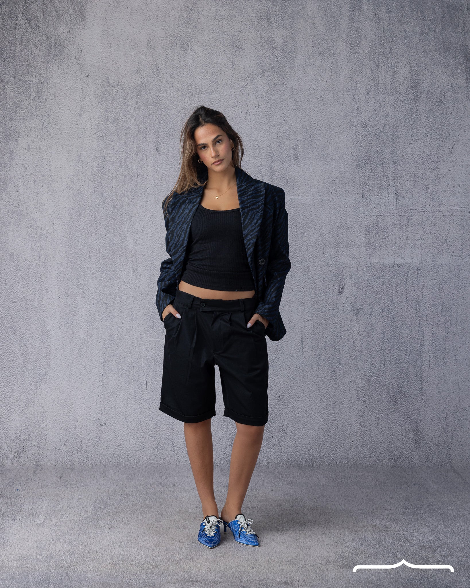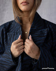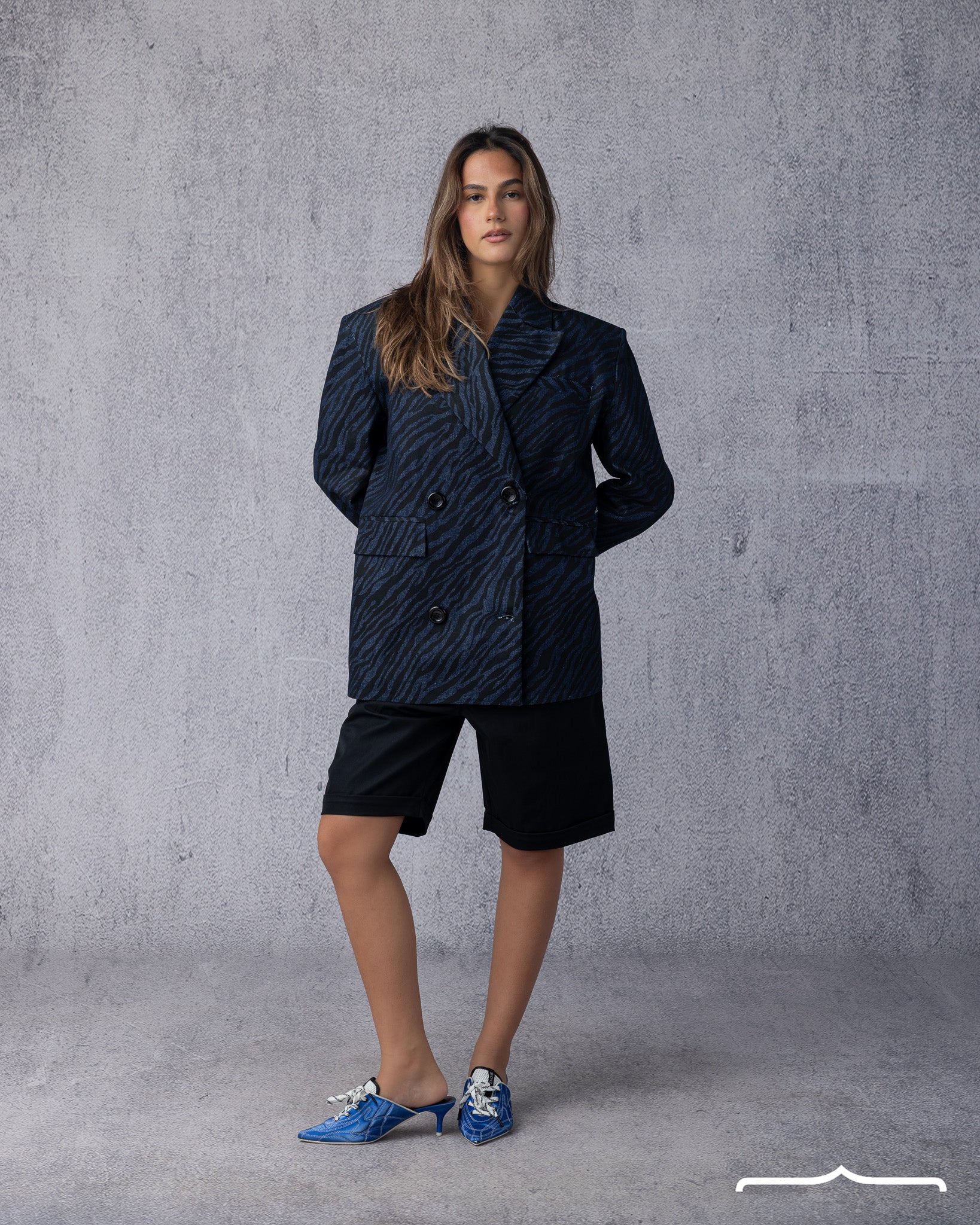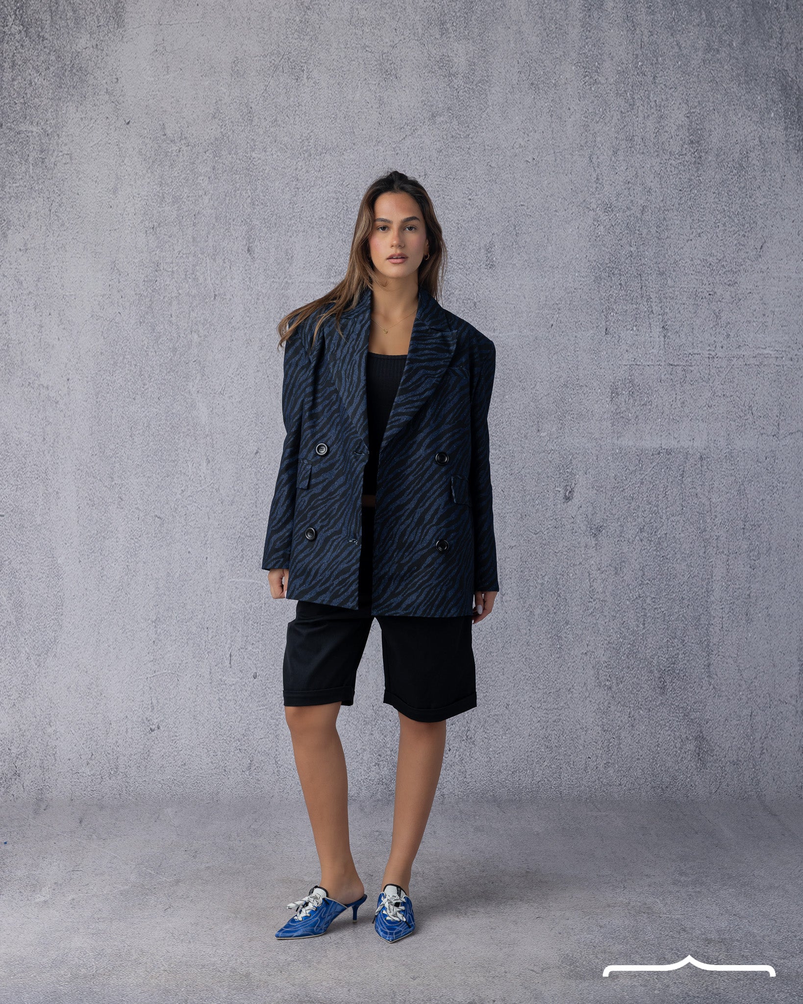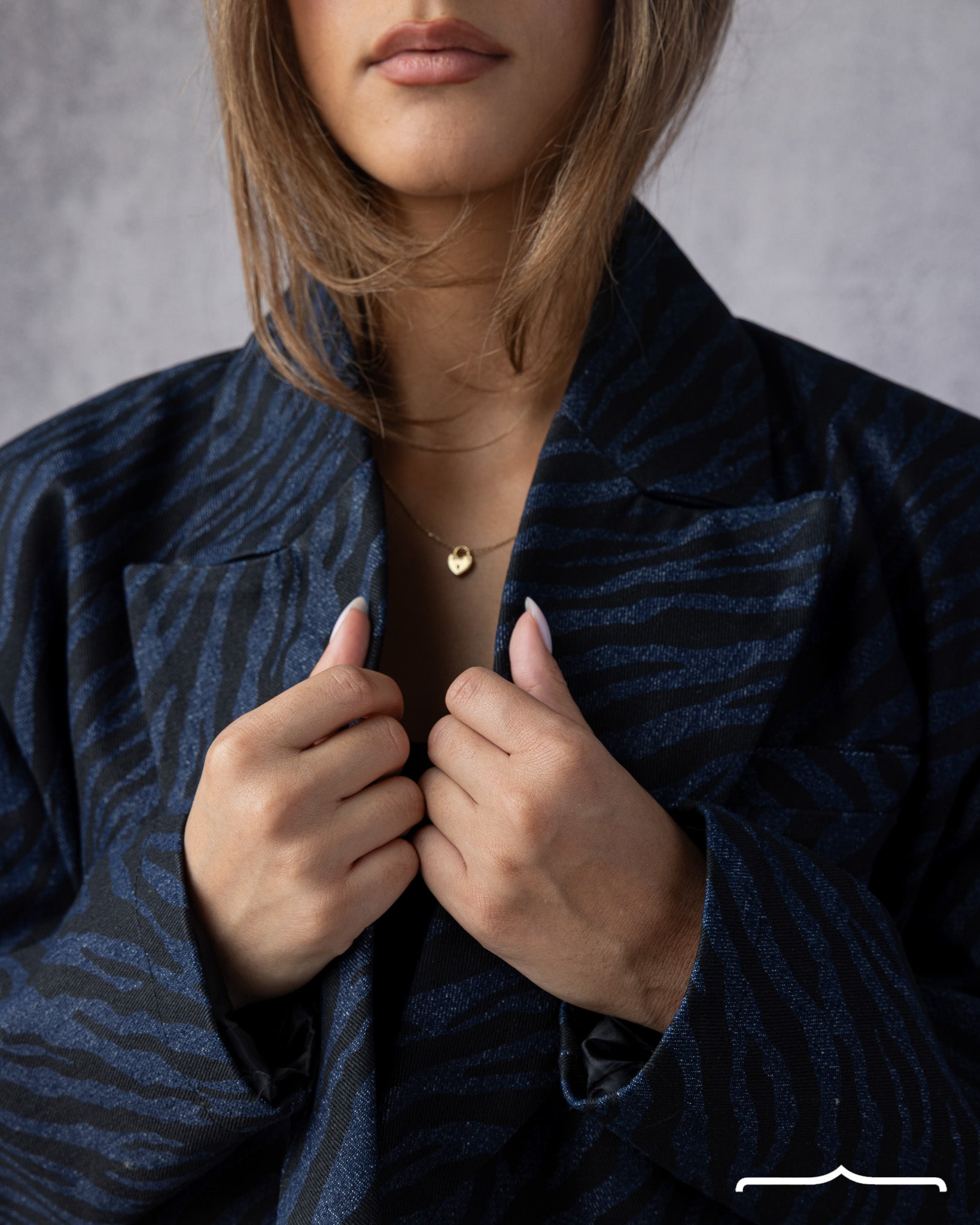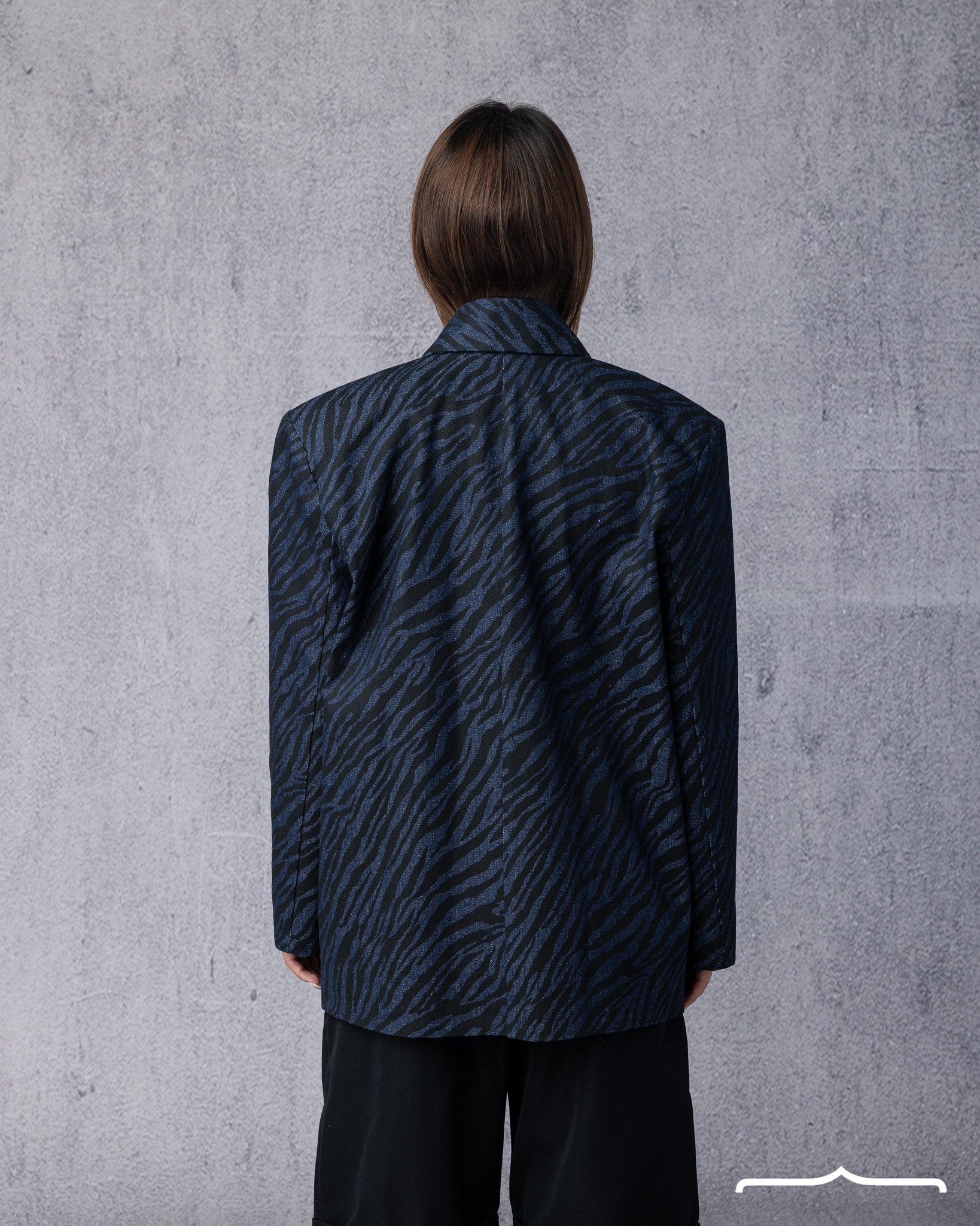 Oversized zebra-print denim blazer made to stand out with effortless edge.