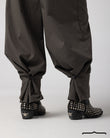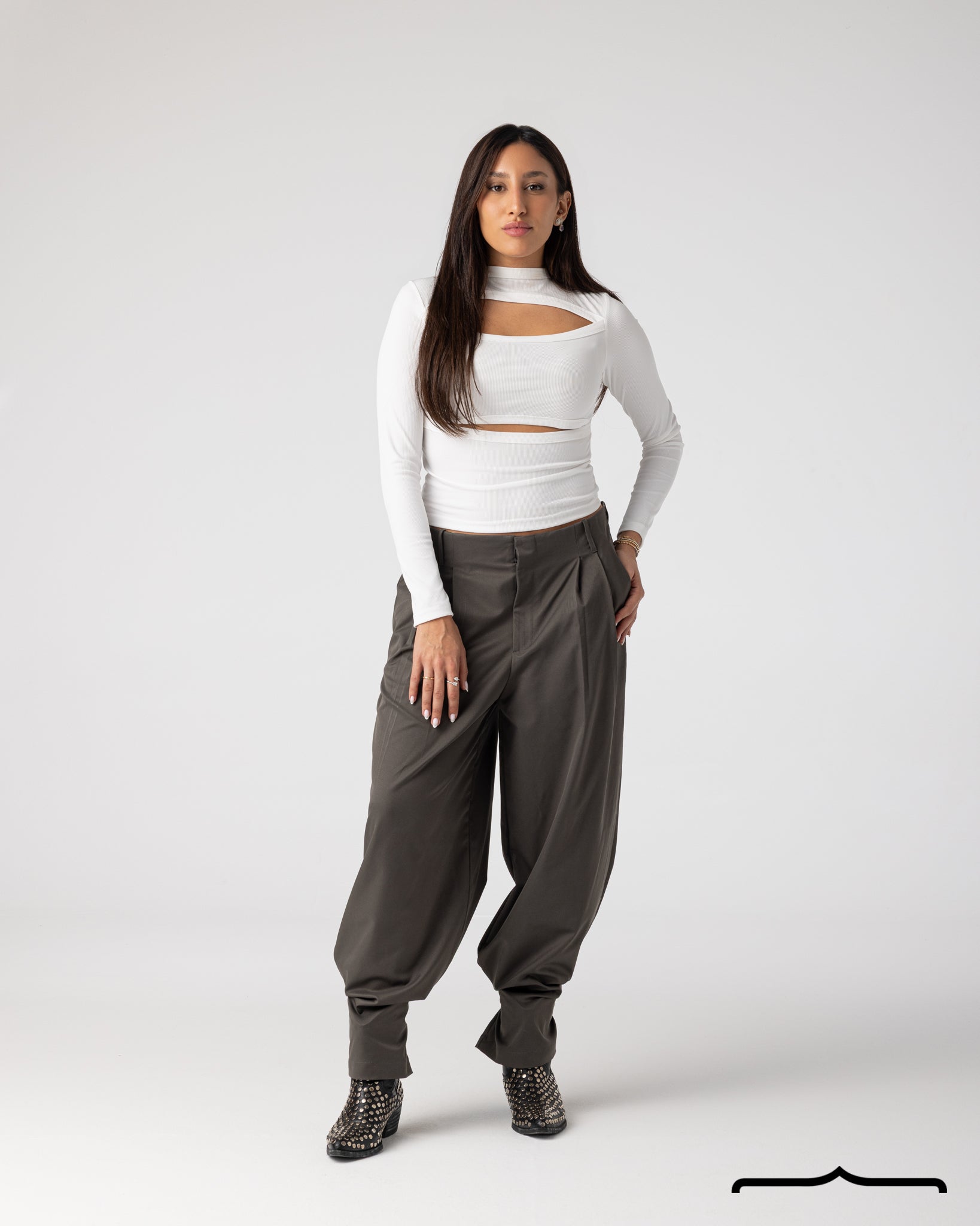 Relaxed-fit trousers with a sculptural wide leg and buttoned ankle detail — turning a simple look into a standout moment.