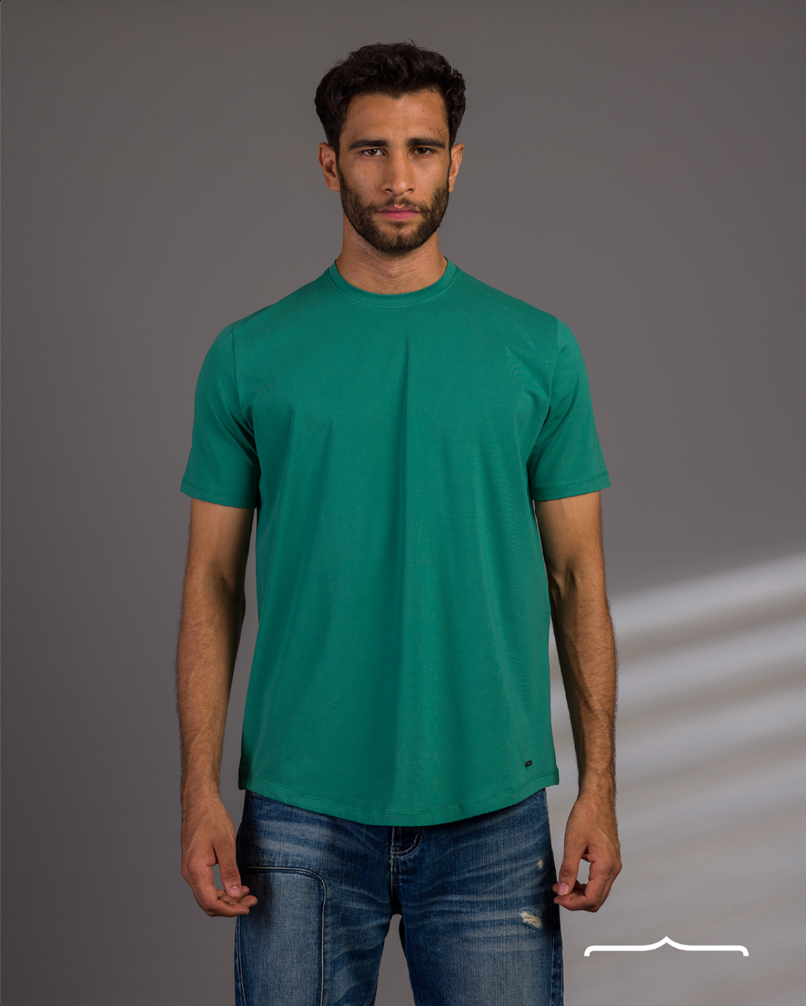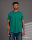 Experience the comfort and casual style of our green Curved Hem t-shirt, featuring a round neck.
