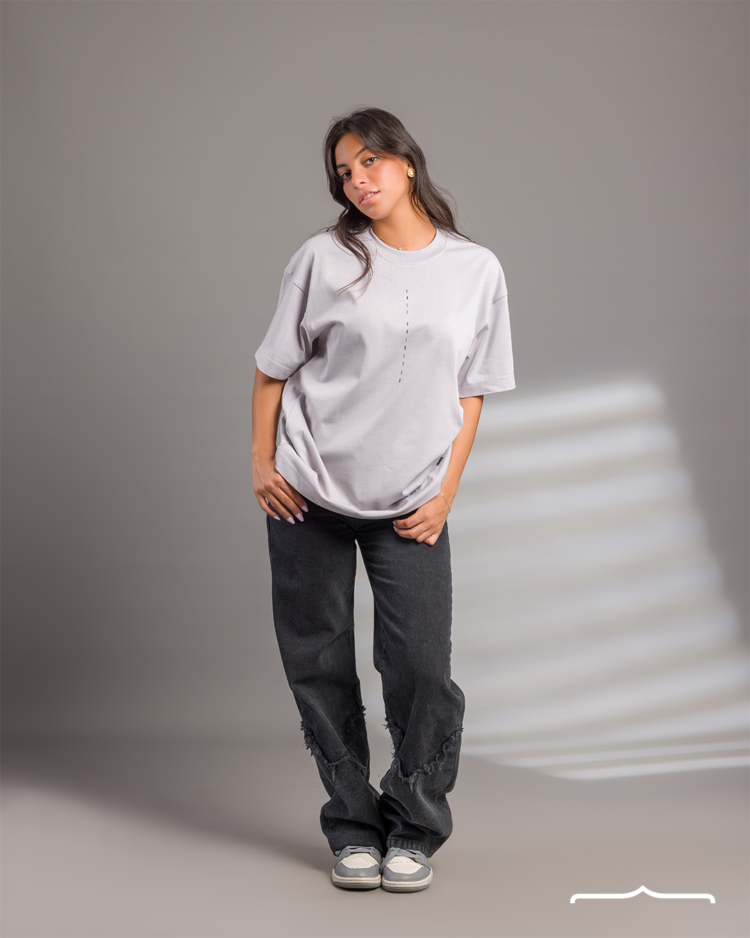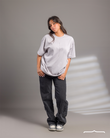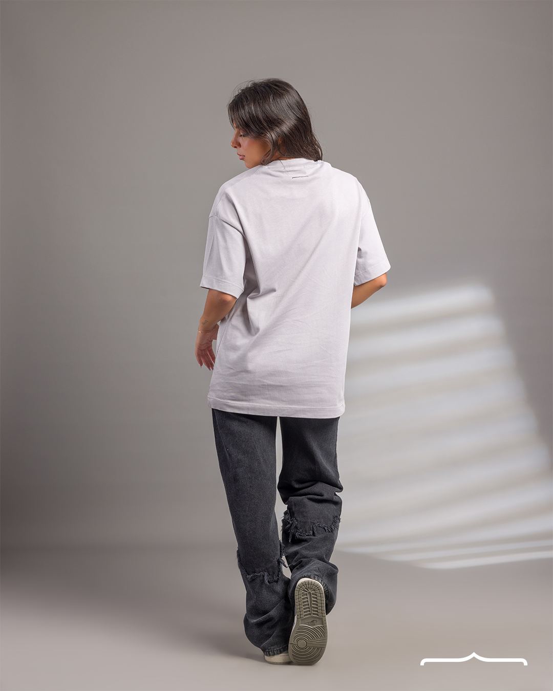 An oversized, round-neck t-shirt with a simple design and "free spirited" written vertically on the front.