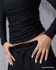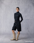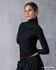 A fitted blouse featuring elegant draped detailing and a sleek high neckline. Designed to contour the body with effortless sophistication.