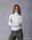 A fitted blouse featuring elegant, draped detailing and a sleek, high neckline. Designed to contour the body with effortless sophistication.