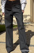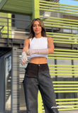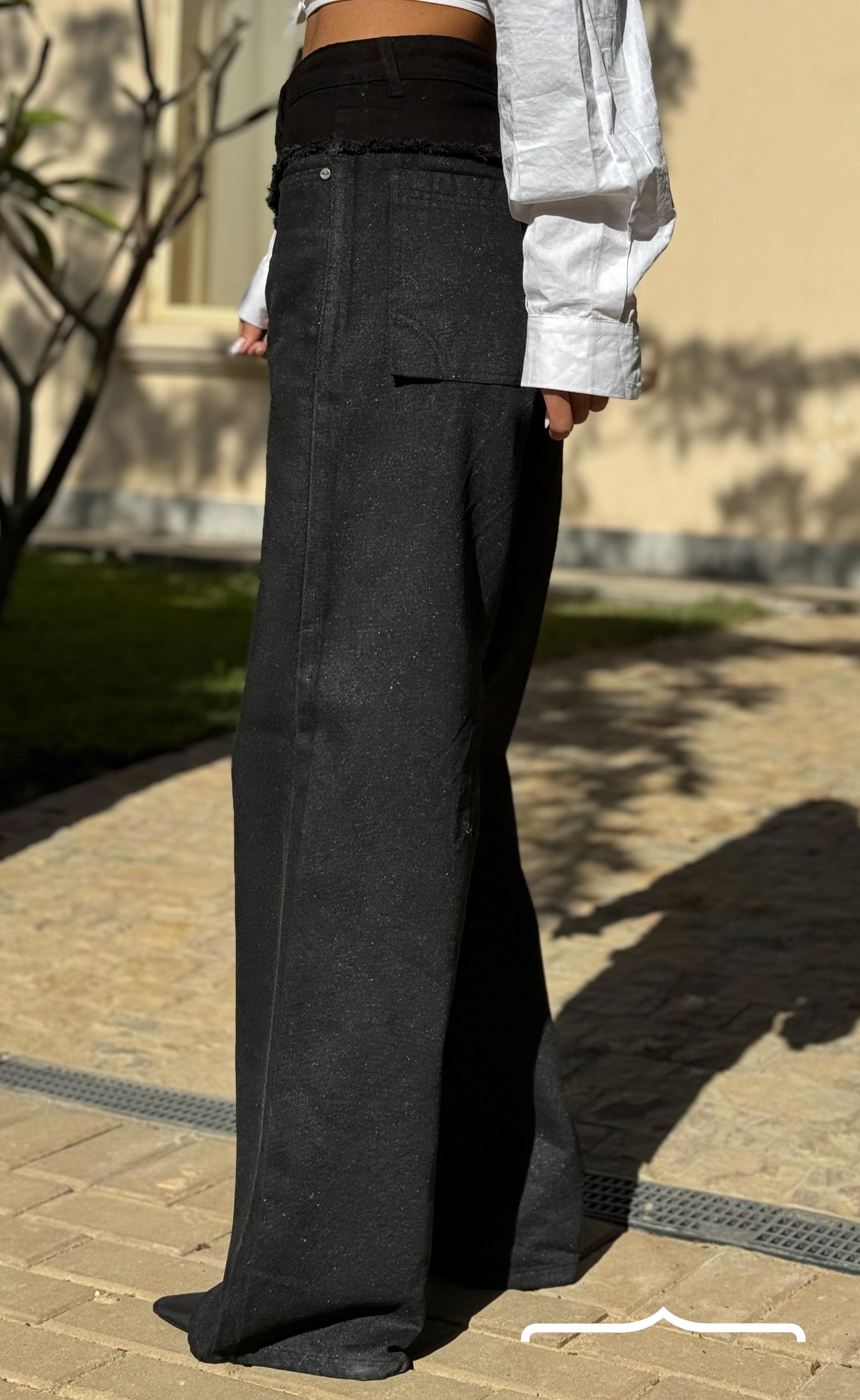 Mid rise Black x Silver sparkle denim with a white raw edge top that looks like a torn white jeans with an underneath silver sparkly one.