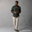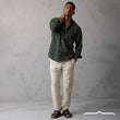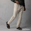 Beige linen pants made to be of a comfortable fit with adjustable strings.