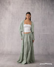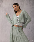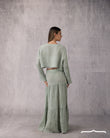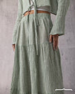 Two-piece set with a flowy high-slit maxi skirt and matching long-sleeve cover-up. Crafted from lightweight textured fabric for an airy, elegant look. Perfect for coastal days or sunset strolls.