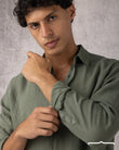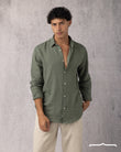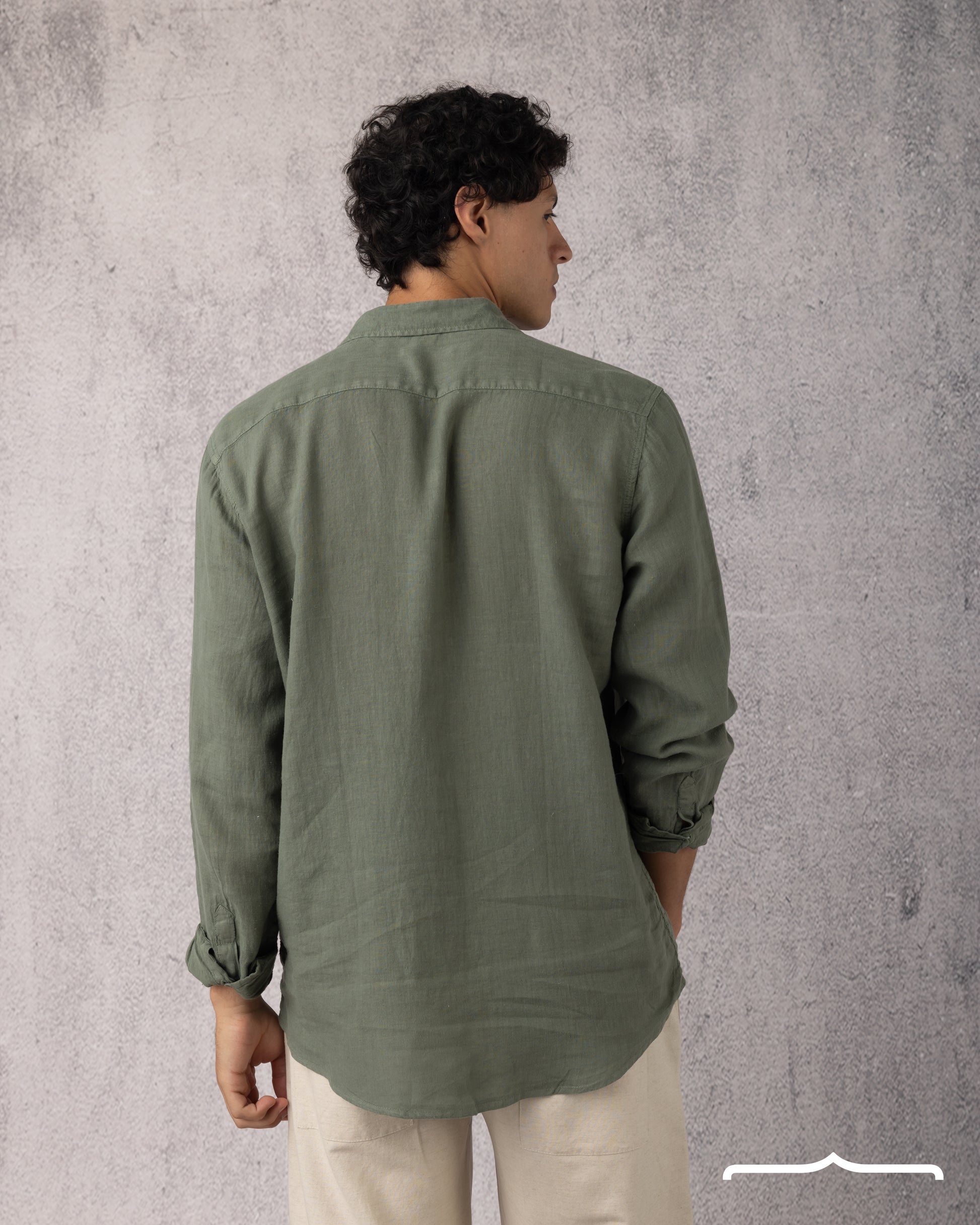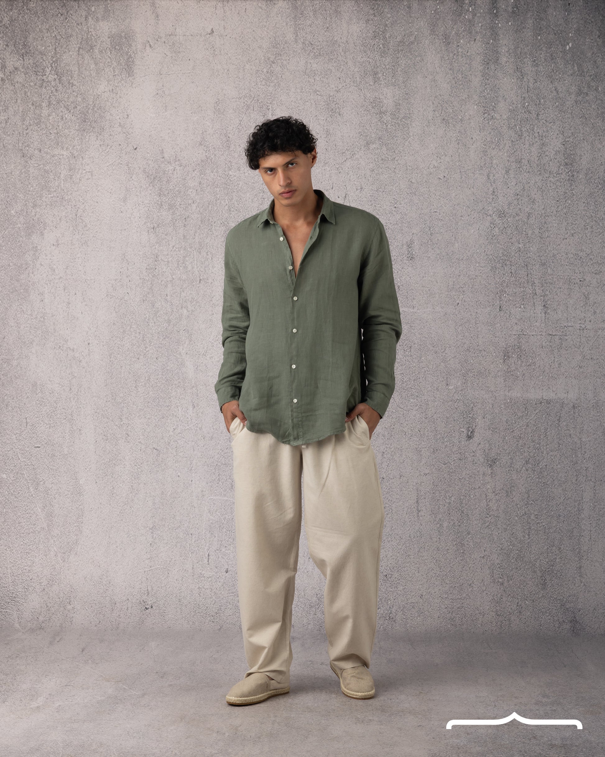 The garment is a lightweight and breathable linen shirt, offering a refined aesthetic with a relaxed yet polished fit. It is suitable for beach outings, summer evenings, or versatile layering throughout the year.