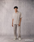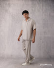 Relaxed short-sleeve shirt paired with matching straight-leg pants.
