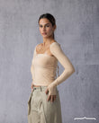 A sleek, seamless blouse featuring an open back design. Minimal yet striking, crafted for an effortlessly elegant look.