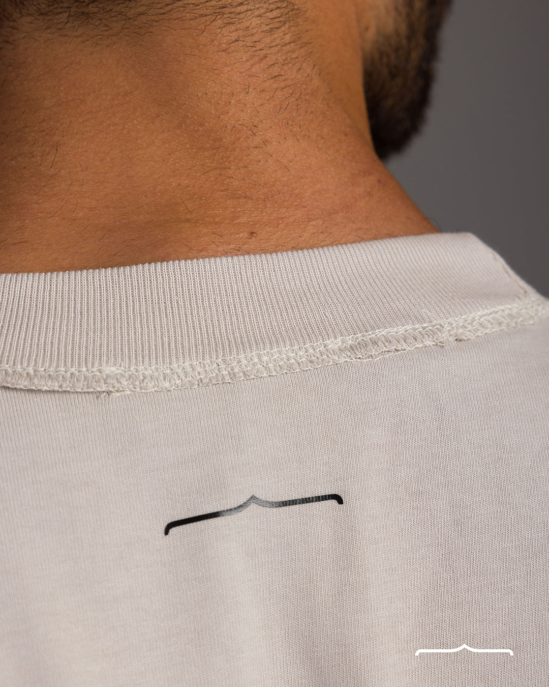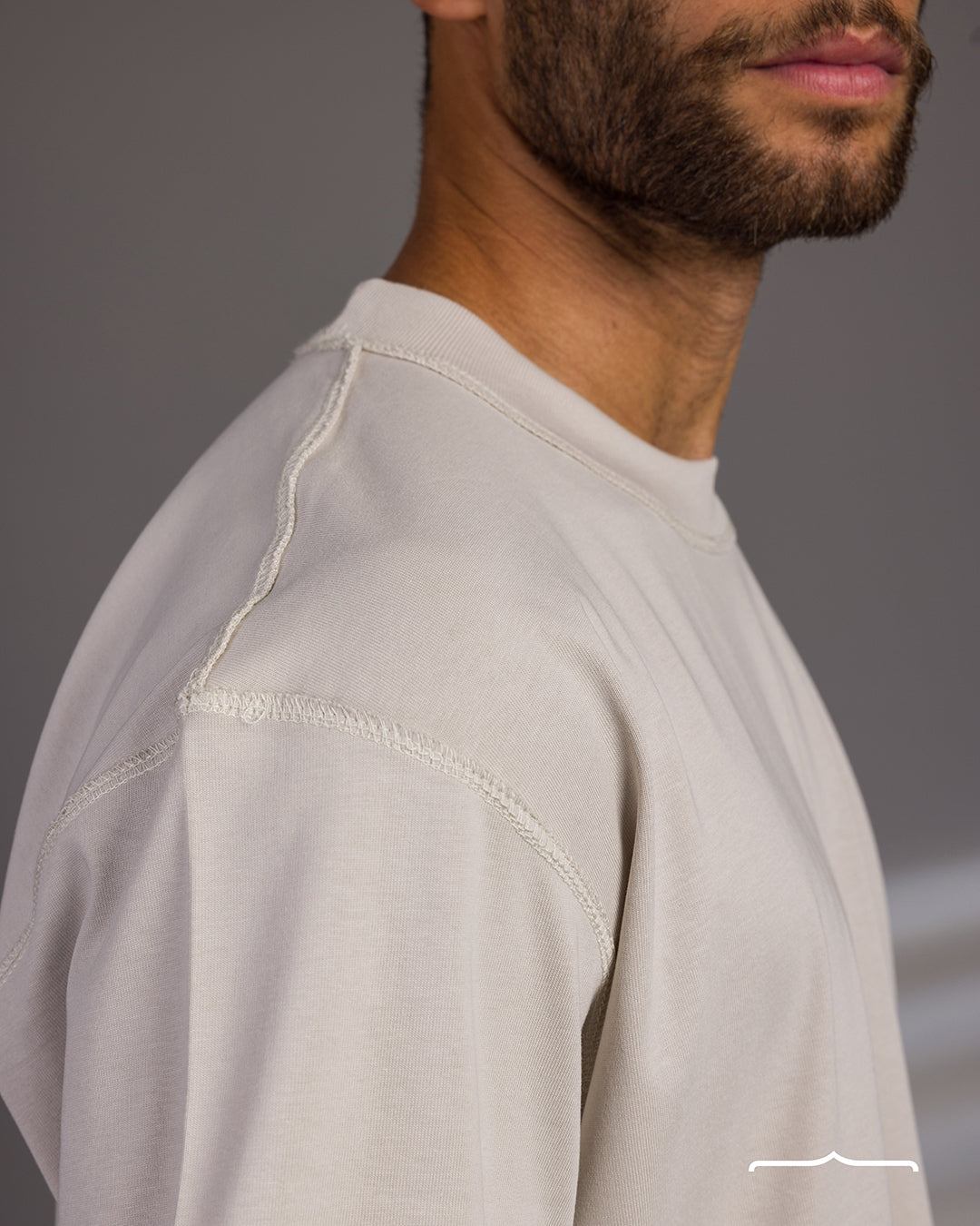 Beige oversized T-shirt with a raw-edge collar, made from heavy jersey. It features a Stache metal logo on the side and a logo on the back.