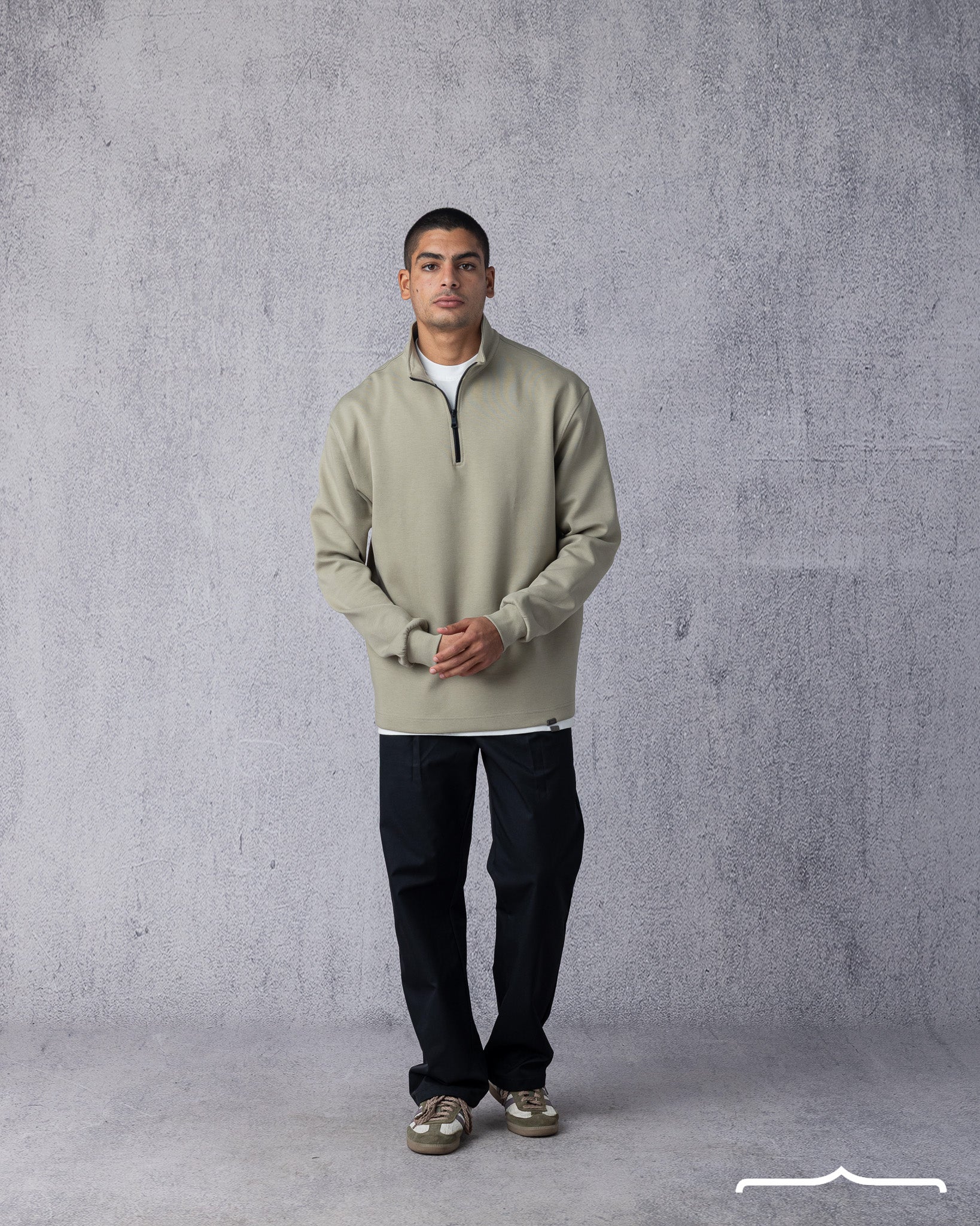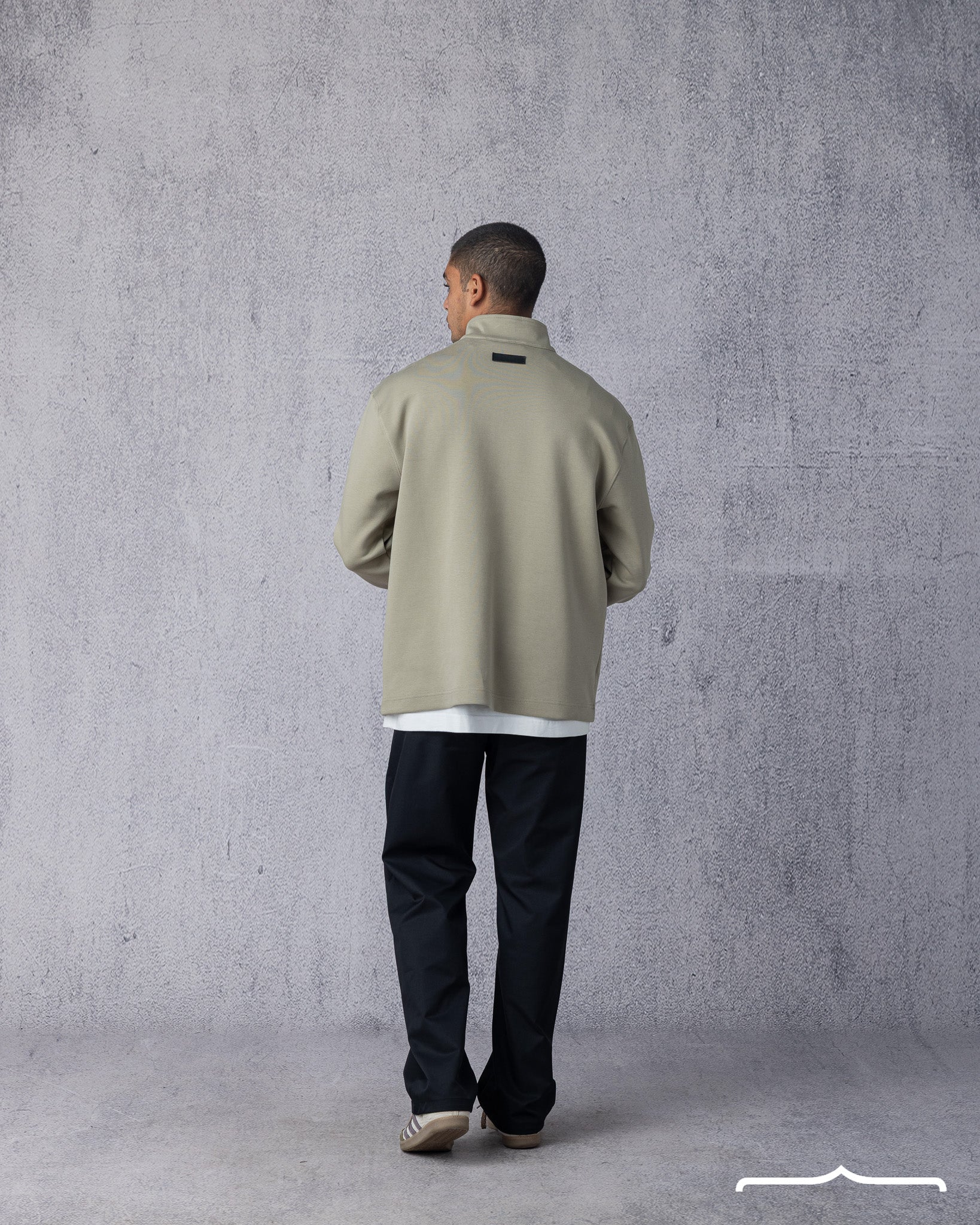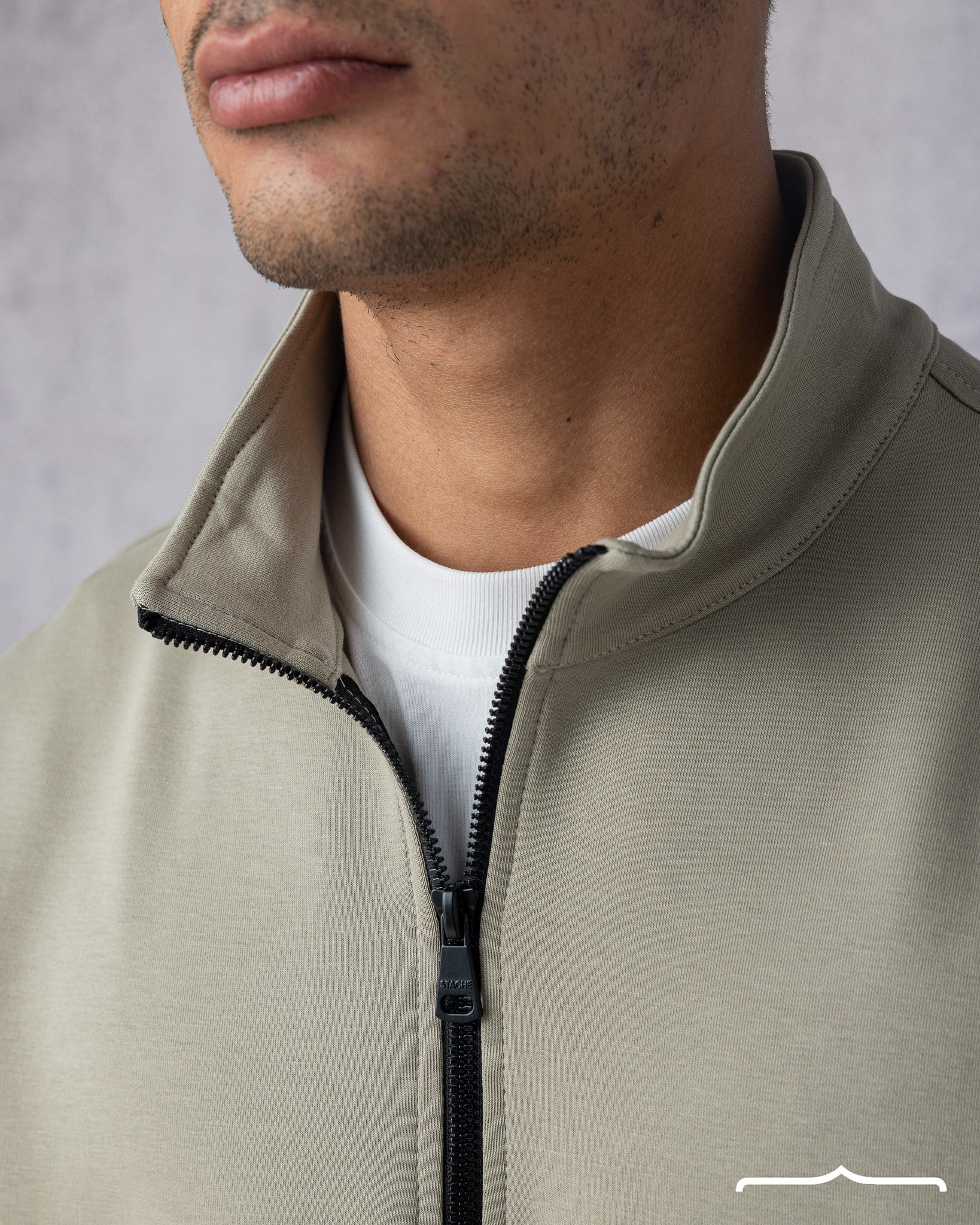 An elevated essential featuring a sleek zipped collar and a relaxed, structured silhouette. Crafted from soft fabric, it blends understated elegance with everyday comfort.