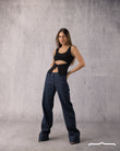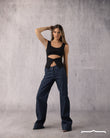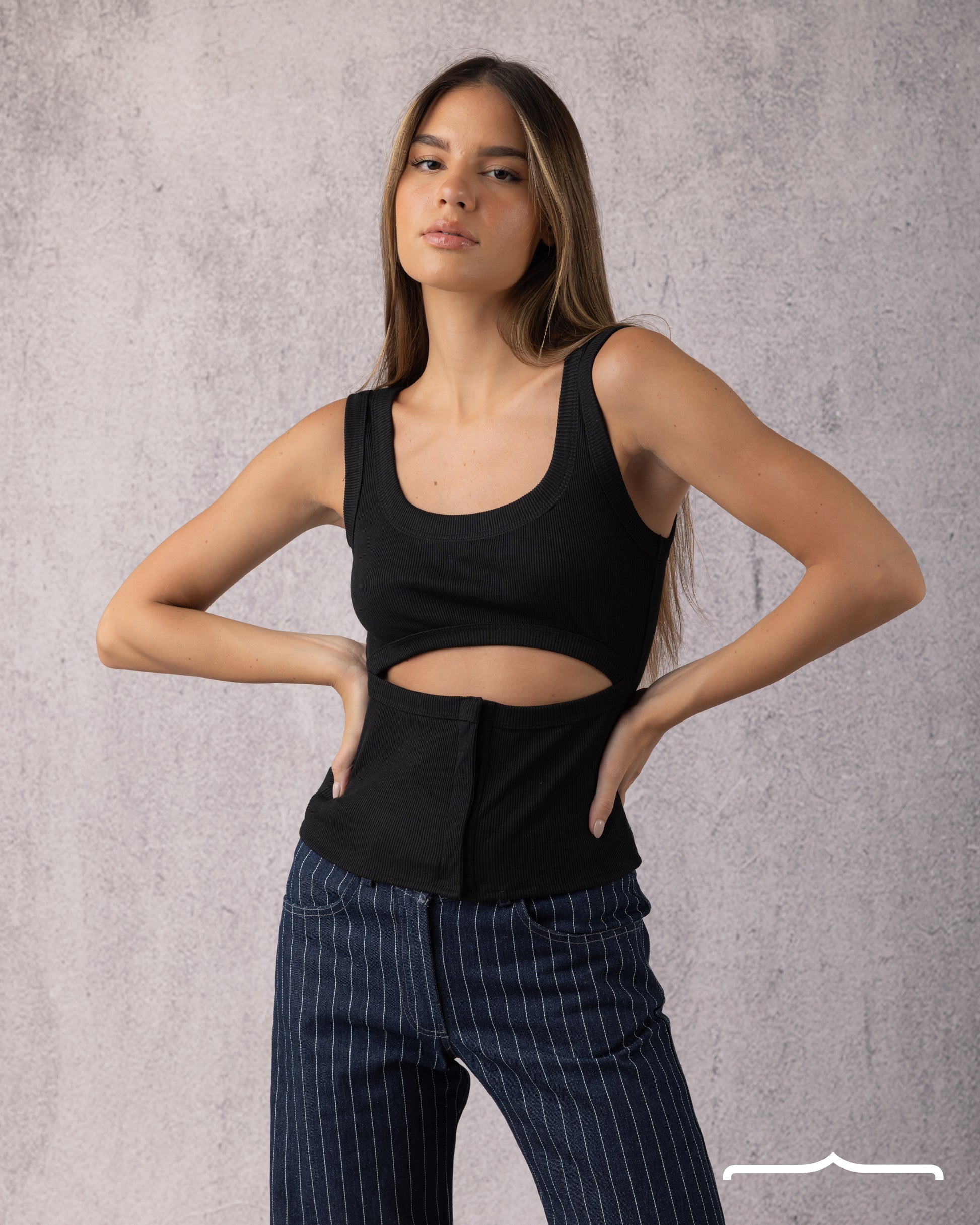 This fabulous tank top showcases a trendy front cut-out, stylish hook-and-eye detail, and an eye-catching asymmetric hem. The ribbed design guarantees you'll shine!