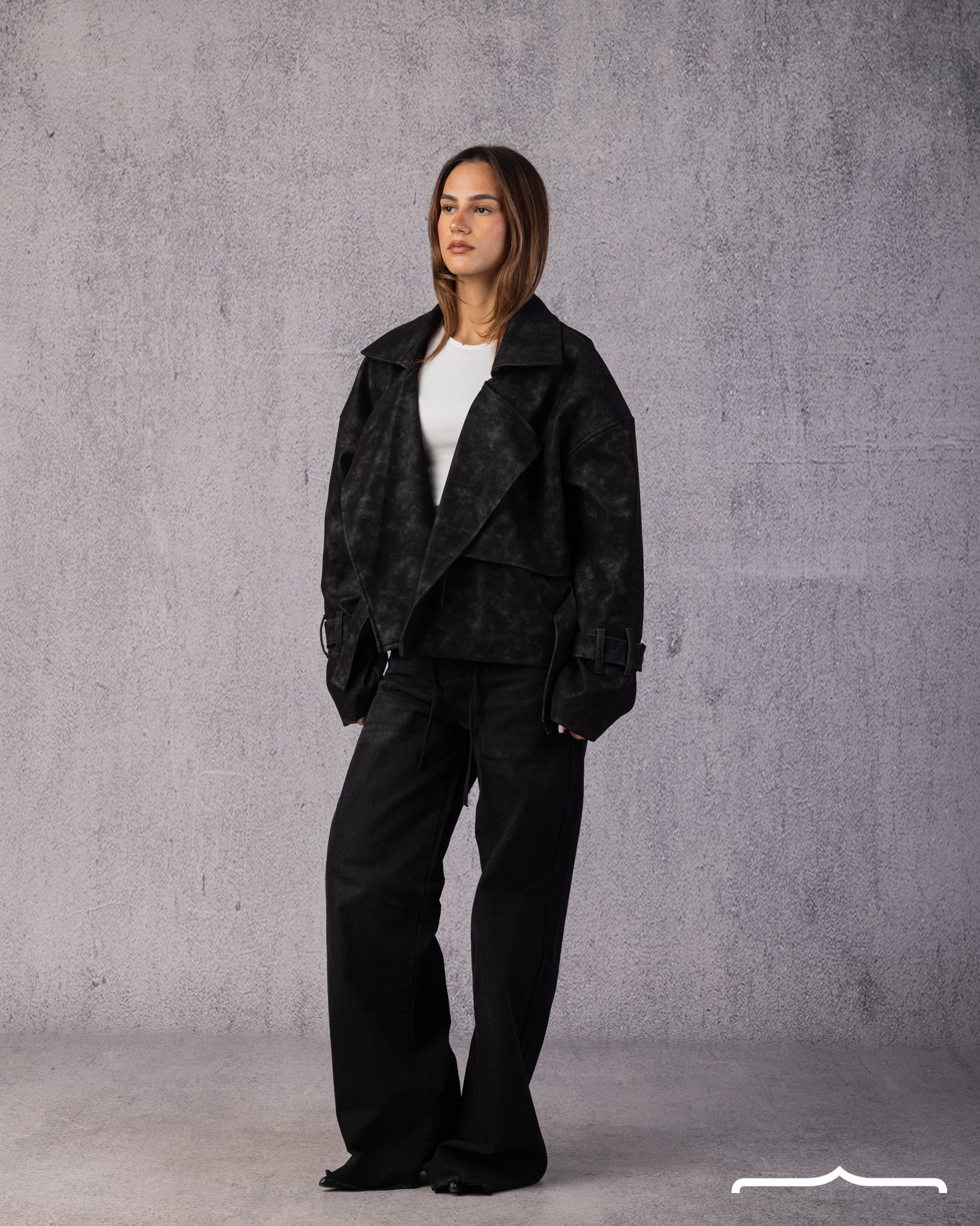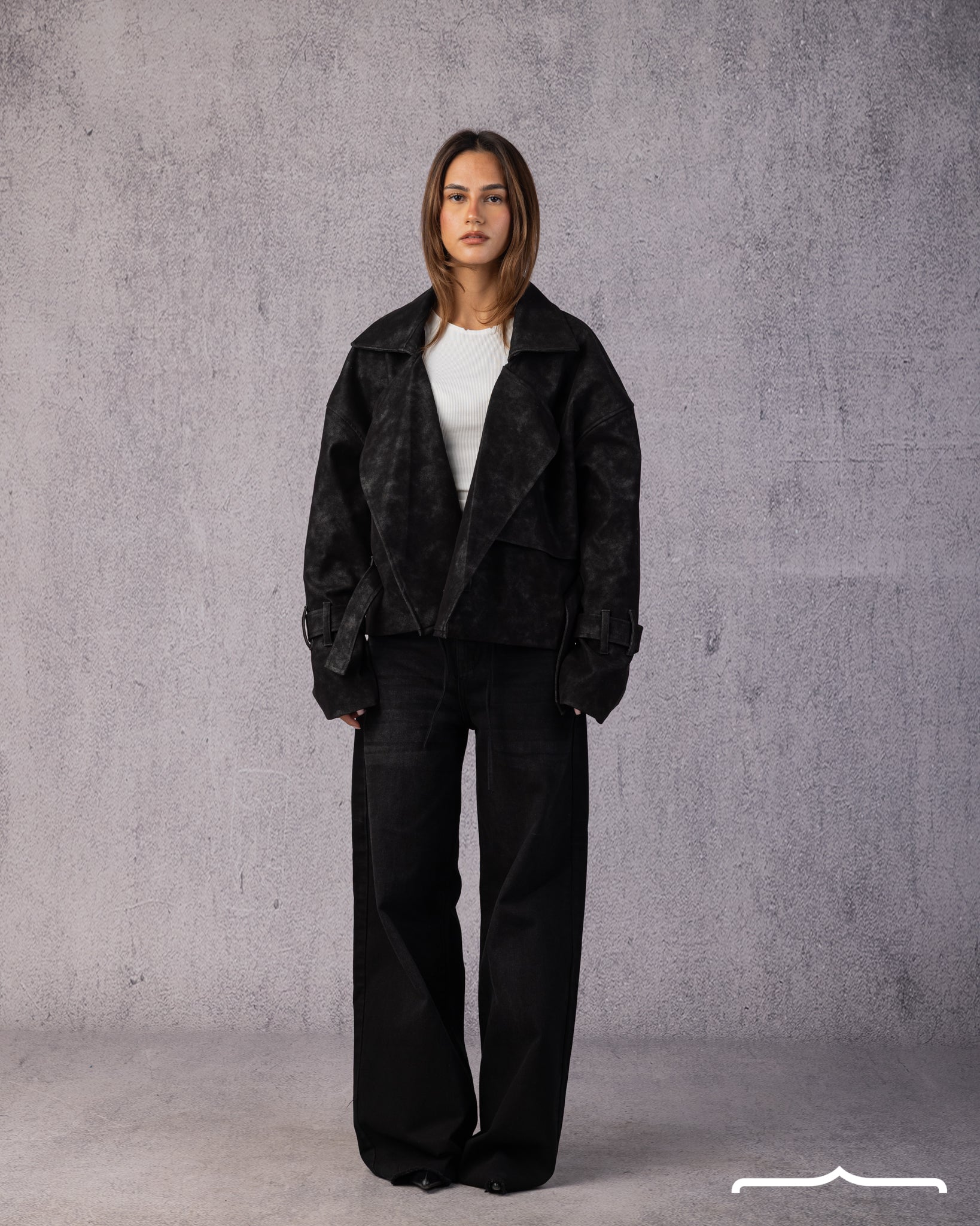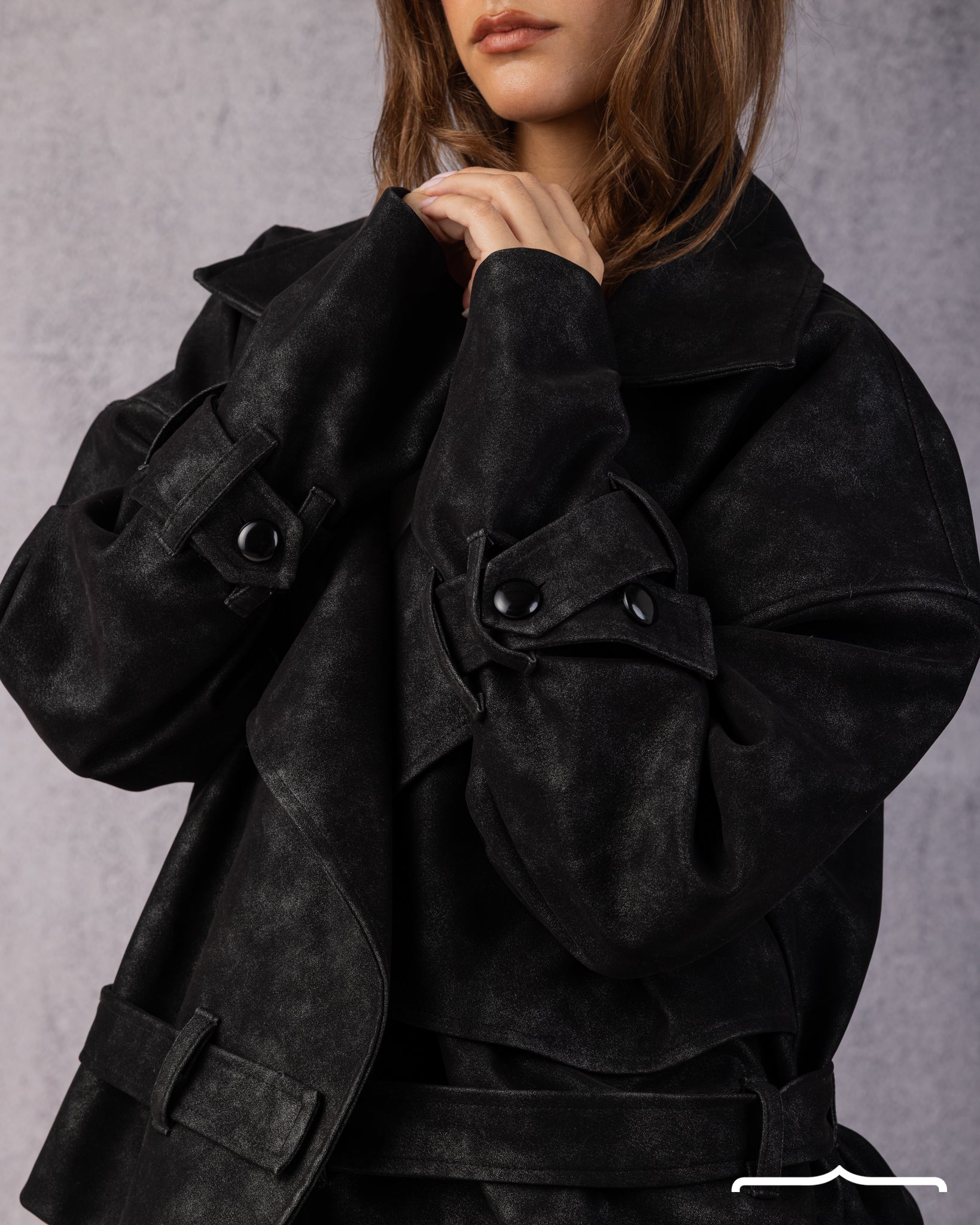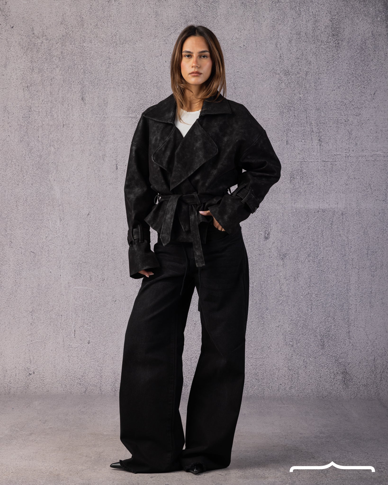 A structured suede jacket with a relaxed fit and waist-defining belt. Strong lines, soft texture, and effortless edge — designed to elevate any look.