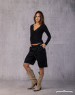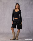 A ruched V-neck top designed to contour the body and highlight the neckline. Soft, flattering, and effortlessly bold — made to elevate any look.