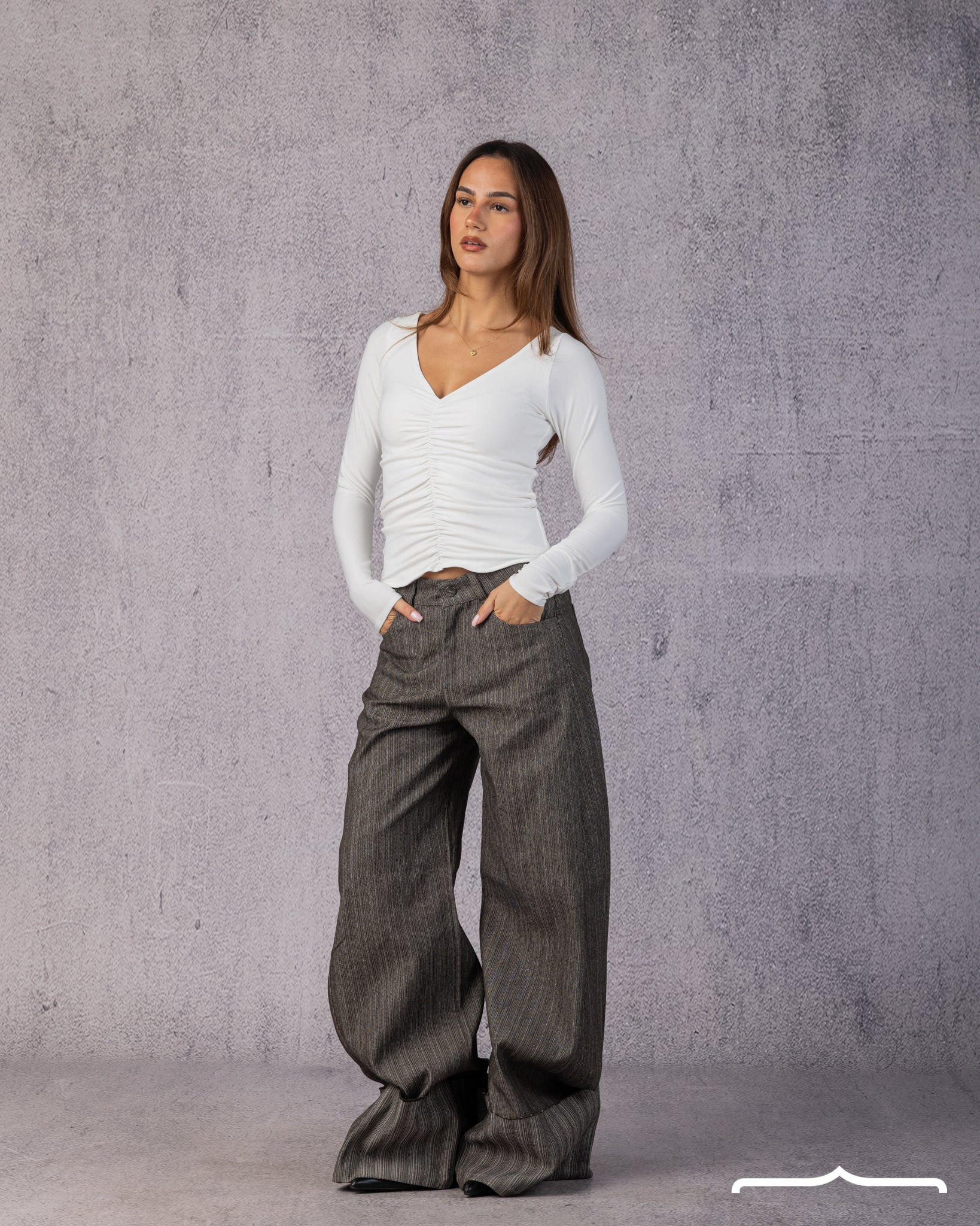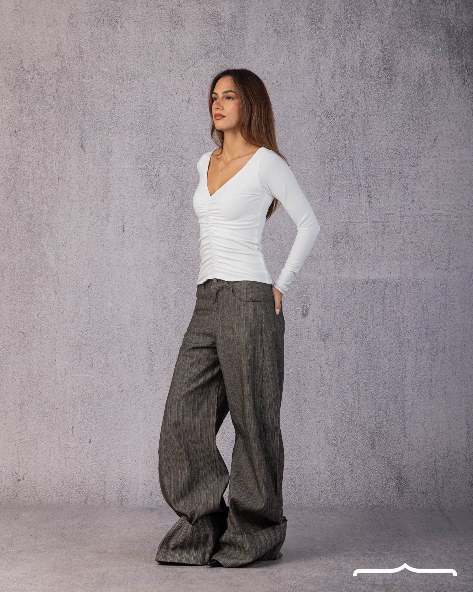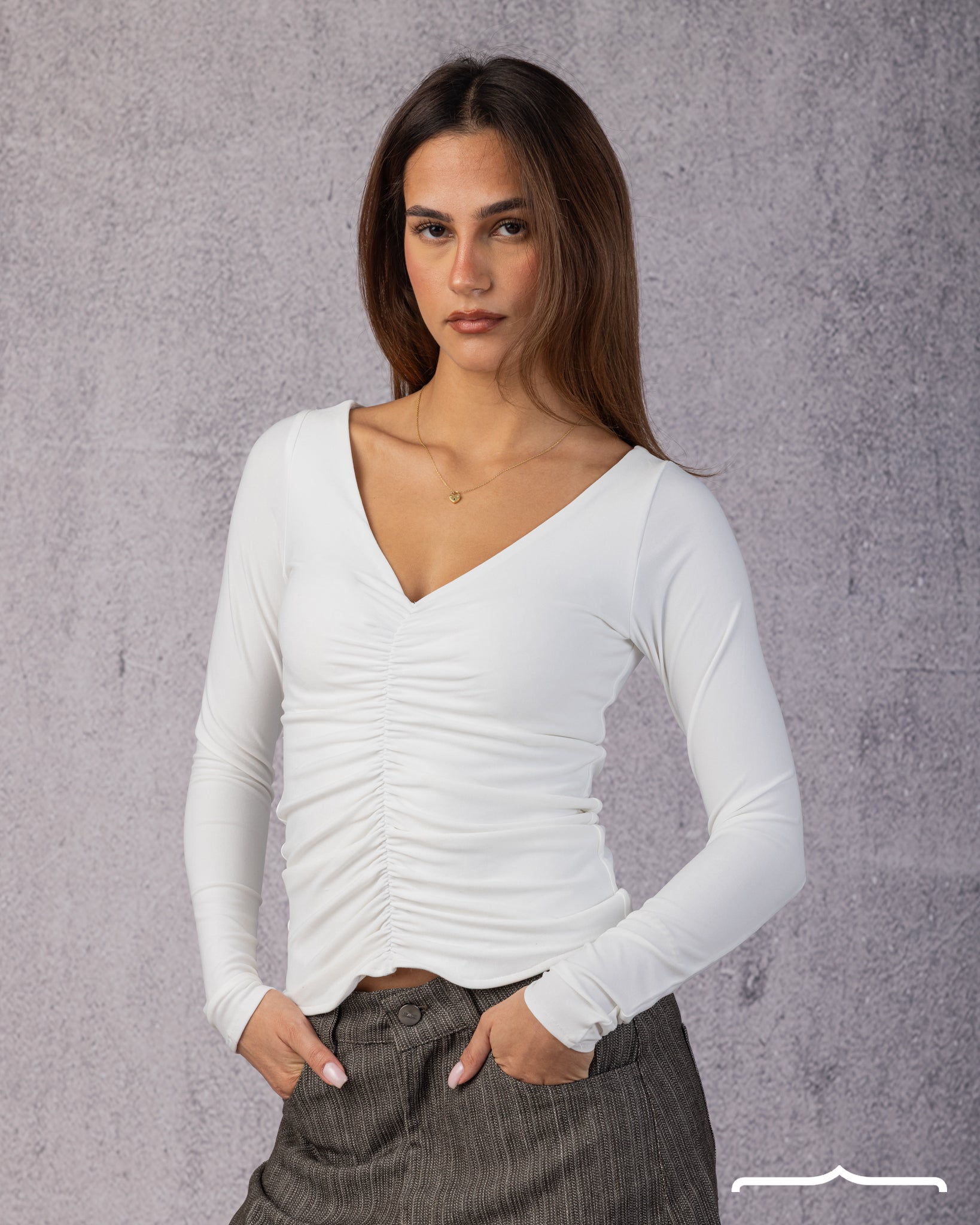 A ruched V-neck top designed to contour the body and highlight the neckline. Soft, flattering, and effortlessly bold — made to elevate any look.